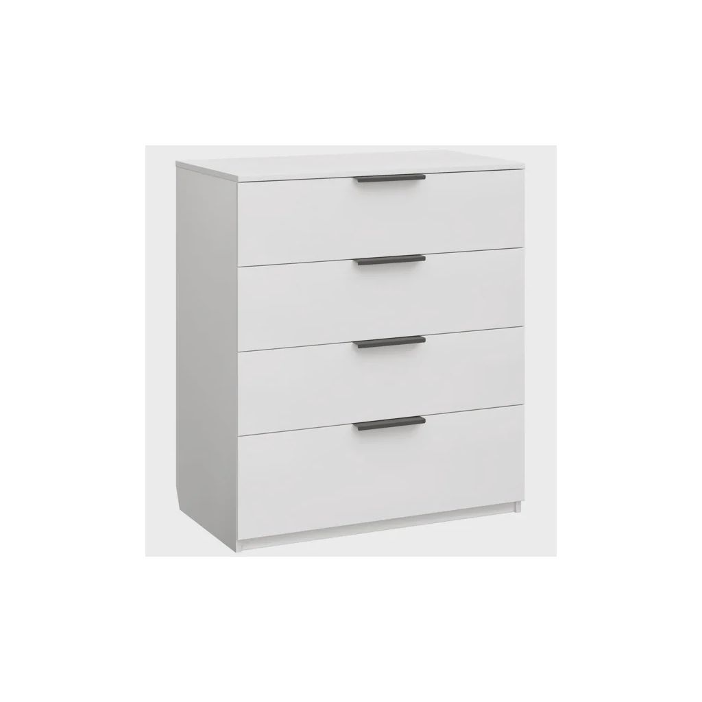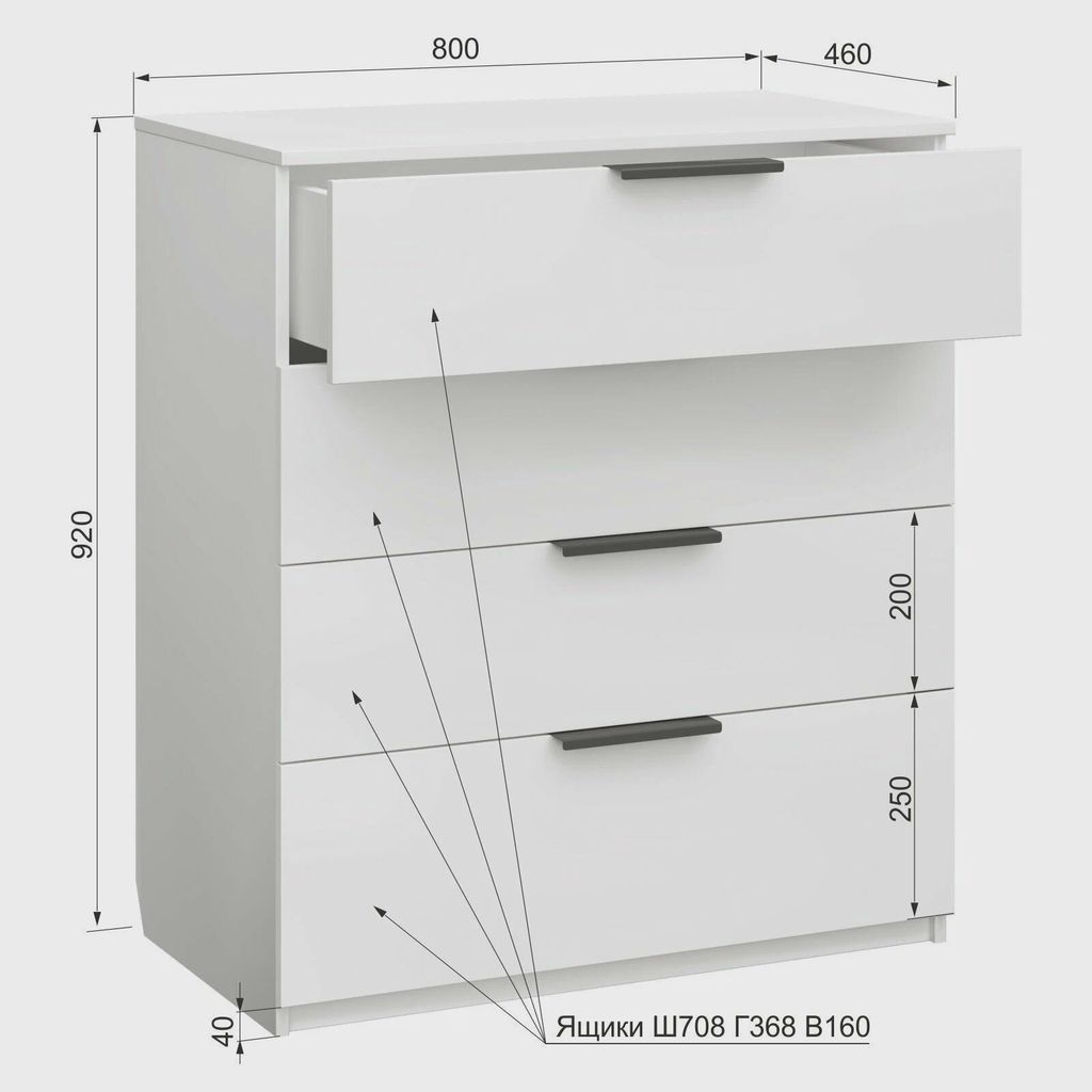 - Выдвижные ящики: комод состоит из четырех вместительных ящиков различной высоты, что позволяет эффективно организовать хранение одежды, белья, аксессуаров и других предметов.