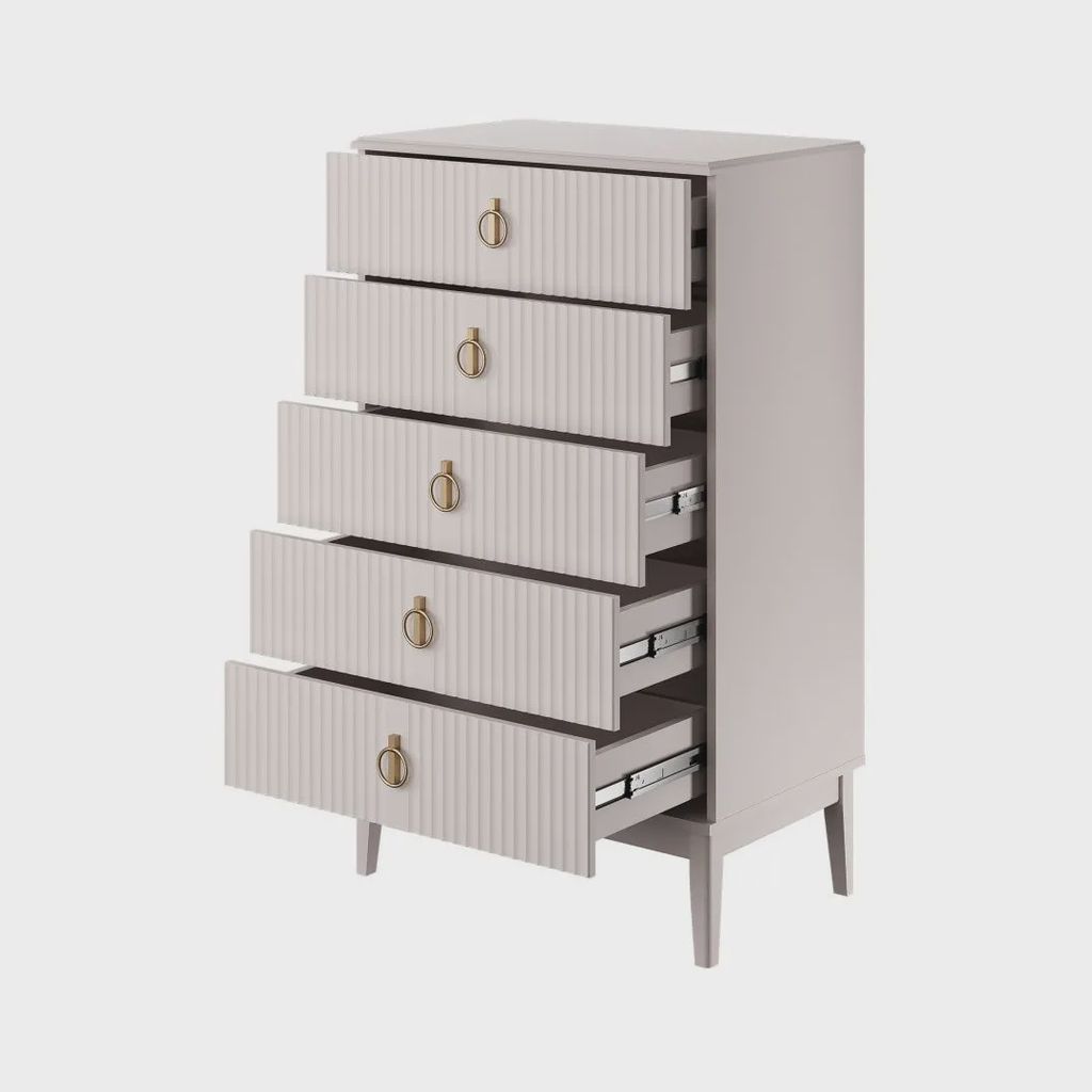 - Пять выдвижных ящиков: удобные и вместительные ящики позволяют эффективно организовать хранение одежды, белья, аксессуаров или других мелочей. Плавные направляющие обеспечивают легкость открывания и закрывания.