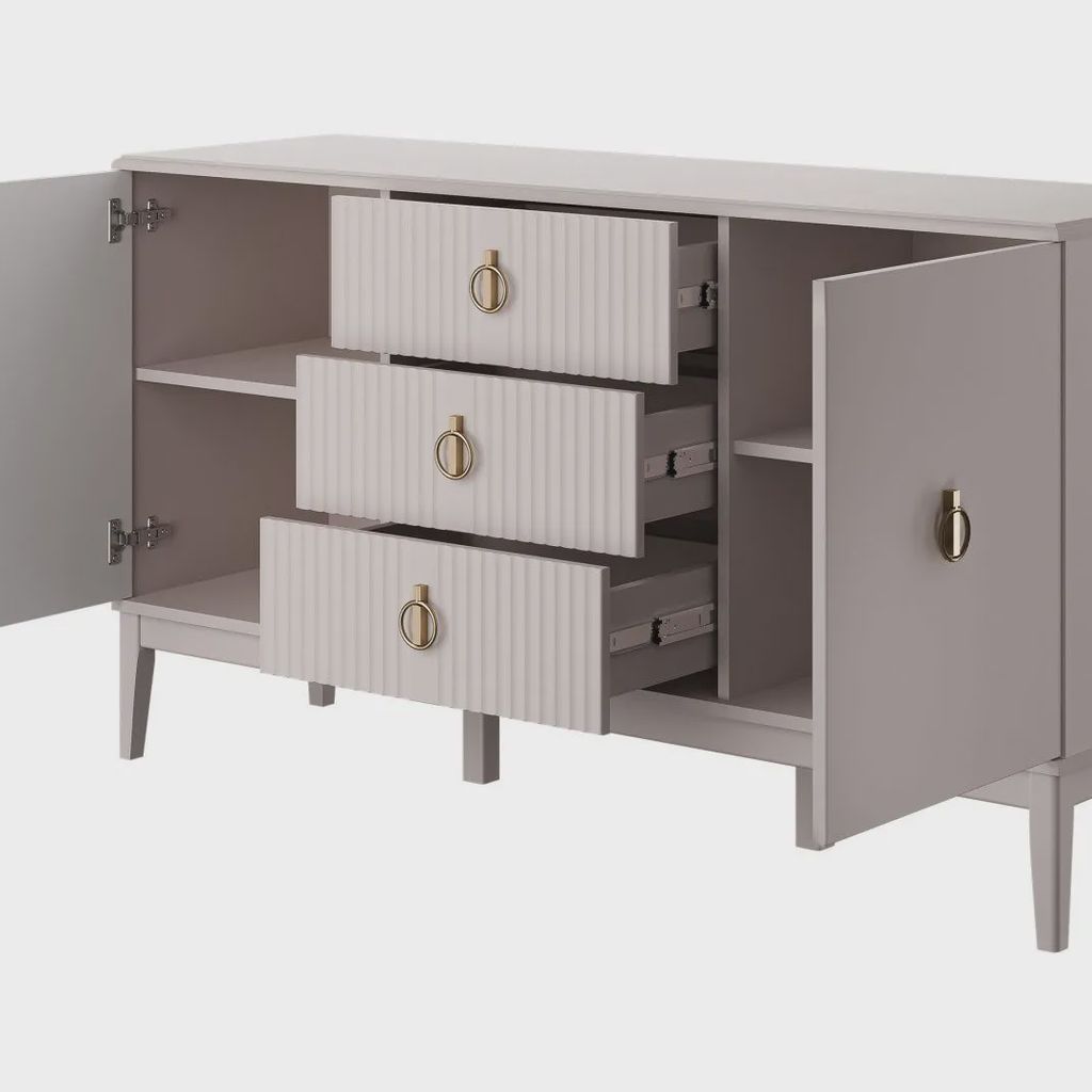 - Ручки и фурнитура выполнены в матовом золотом цвете, что придает комоду роскошный и благородный вид, гармонично вписывая его в любой интерьер.