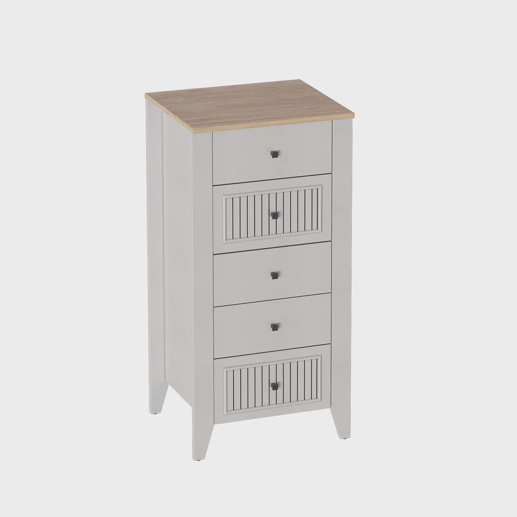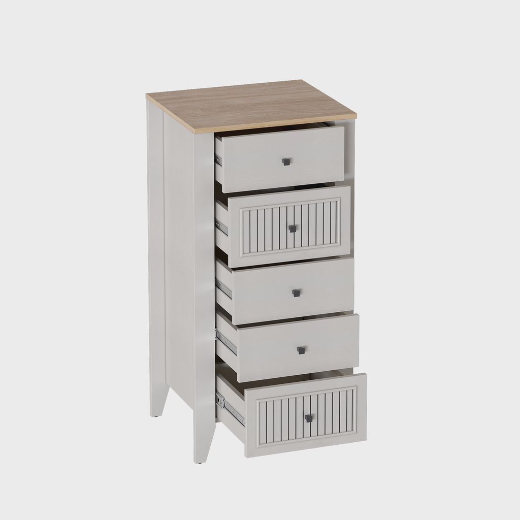 - Комод оснащен пятью выдвижными ящиками, которые обеспечивают удобное хранение одежды, белья, аксессуаров и других предметов. Ящики имеют систему полного выдвижения, что позволяет максимально эффективно использовать пространство.