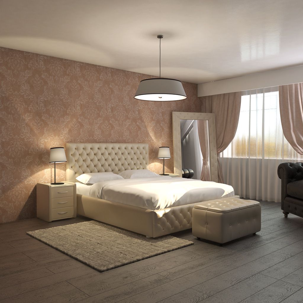 - Высокое изголовье с каретной стяжкой: главная изюминка кровати - это изголовье, выполненное в классической технике каретной стяжки.