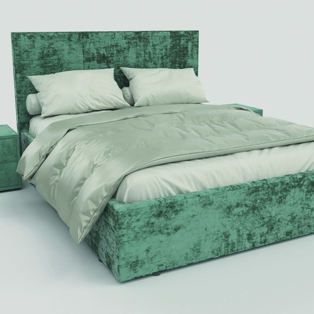 - Полная обтяжка велюром: мягкая ткань делает каждую деталь кровати приятной на ощупь, добавляя практичности и элегантности.