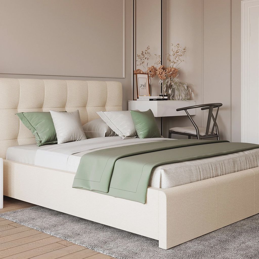 - Материал обивки: кровать выполнена из экокожи бежевого цвета, которая отличается прочностью, устойчивостью к загрязнениям и простотой в уходе.