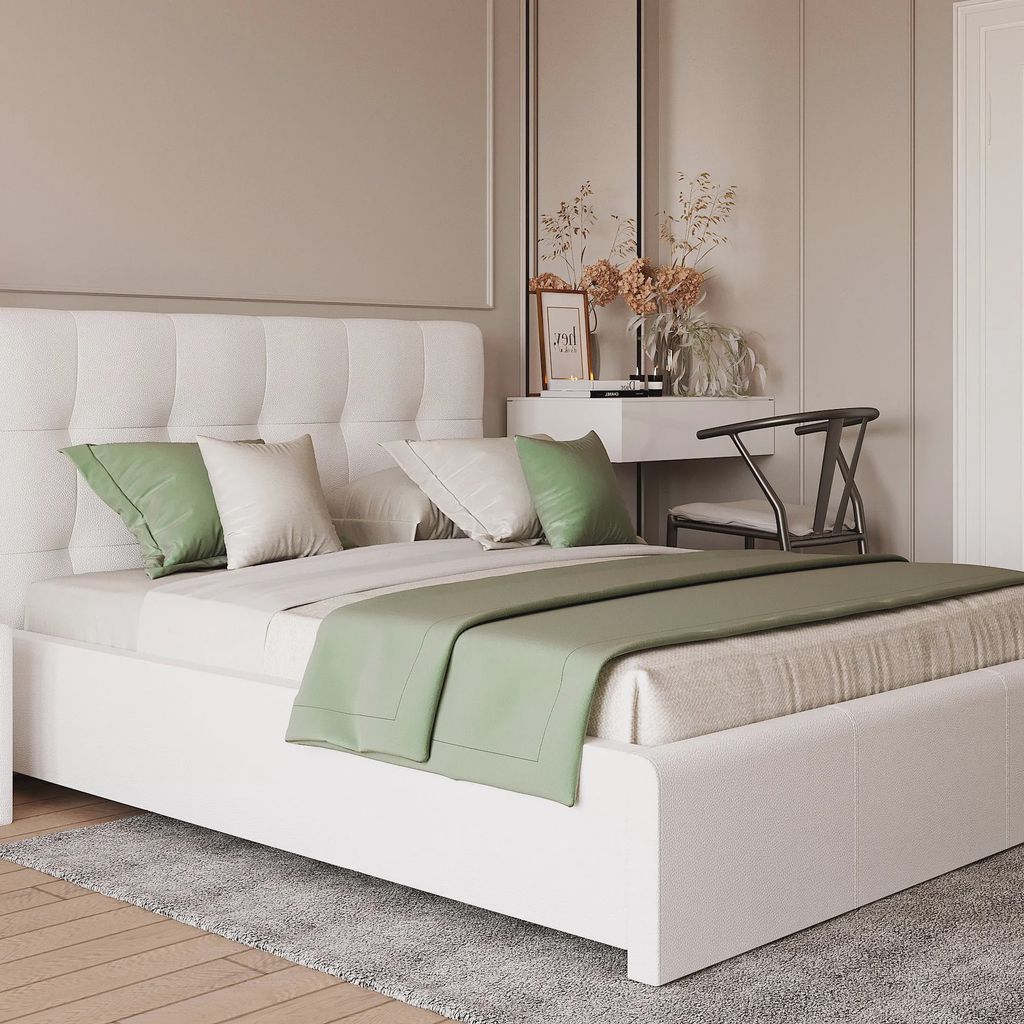 - Элегантный дизайн: белая экокожа создает ощущение роскоши и чистоты, превращая кровать в центральный элемент спальни.