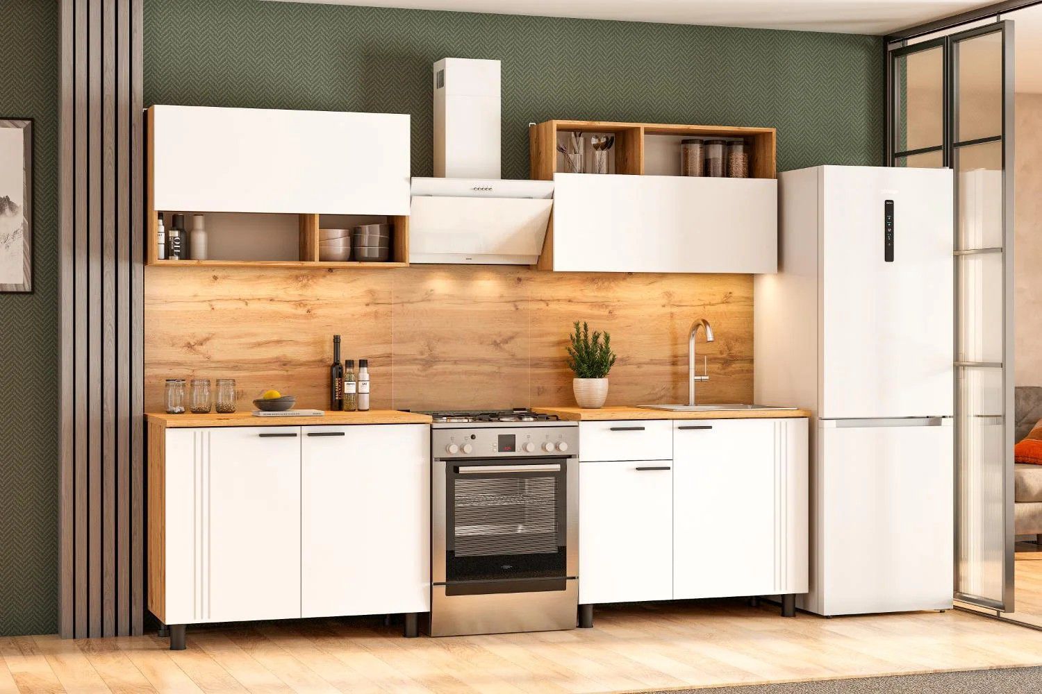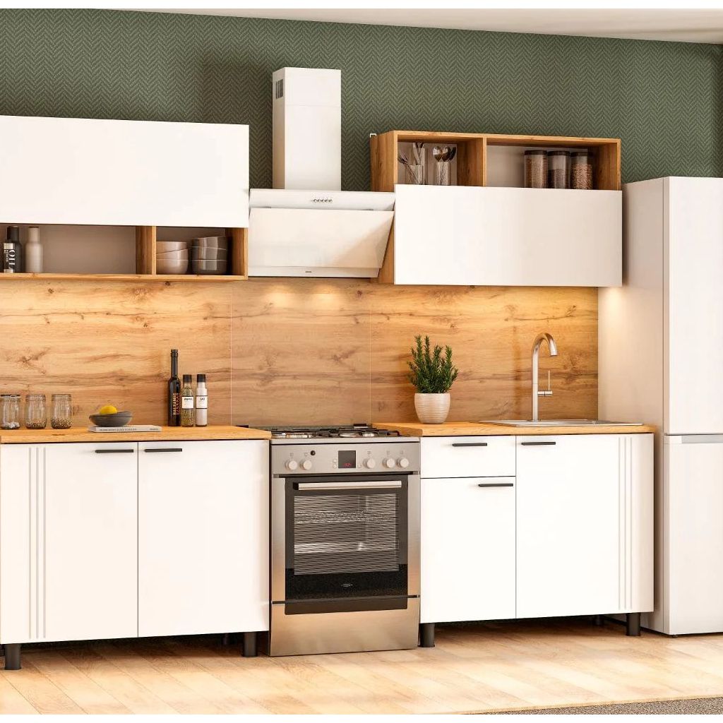 - Цветовая гамма: «Дуб Золотой» + белый фасад — элегантный дуэт, который гармонично впишется в любой стиль: от сканди до современной классики.