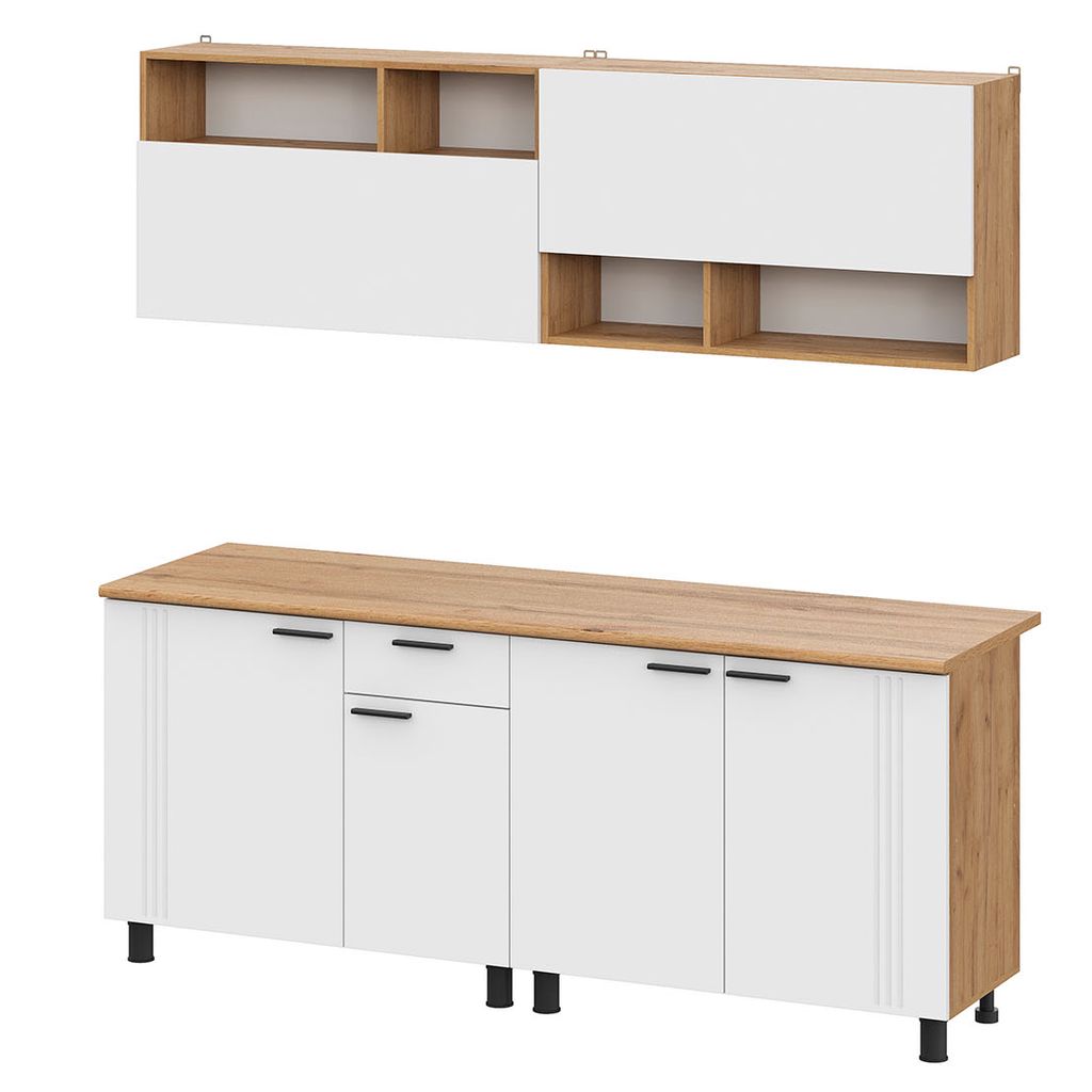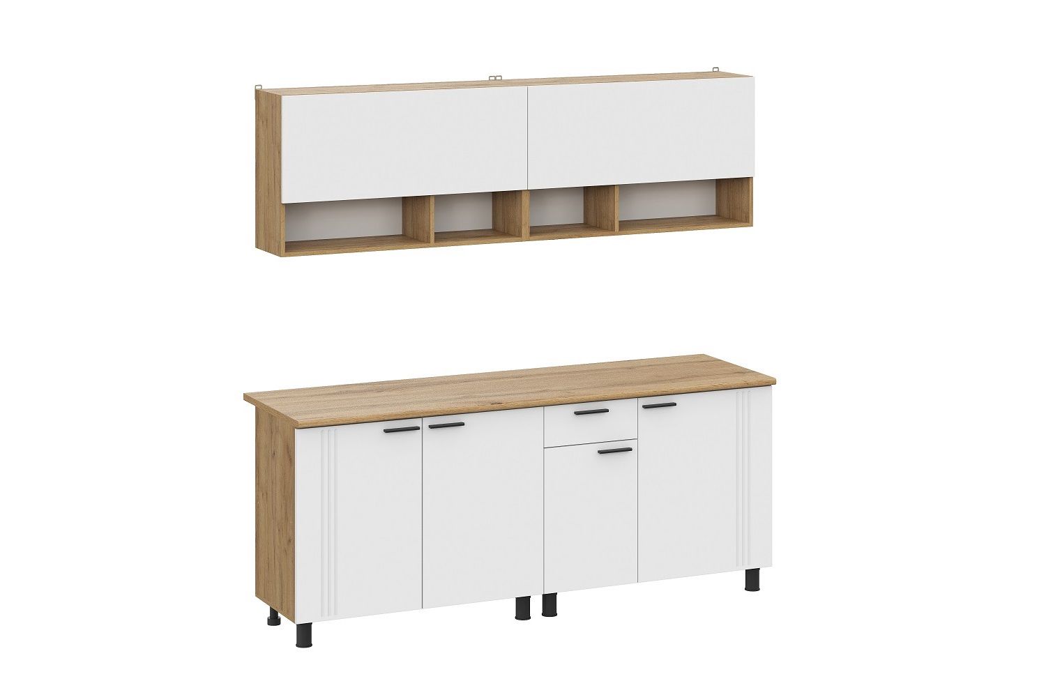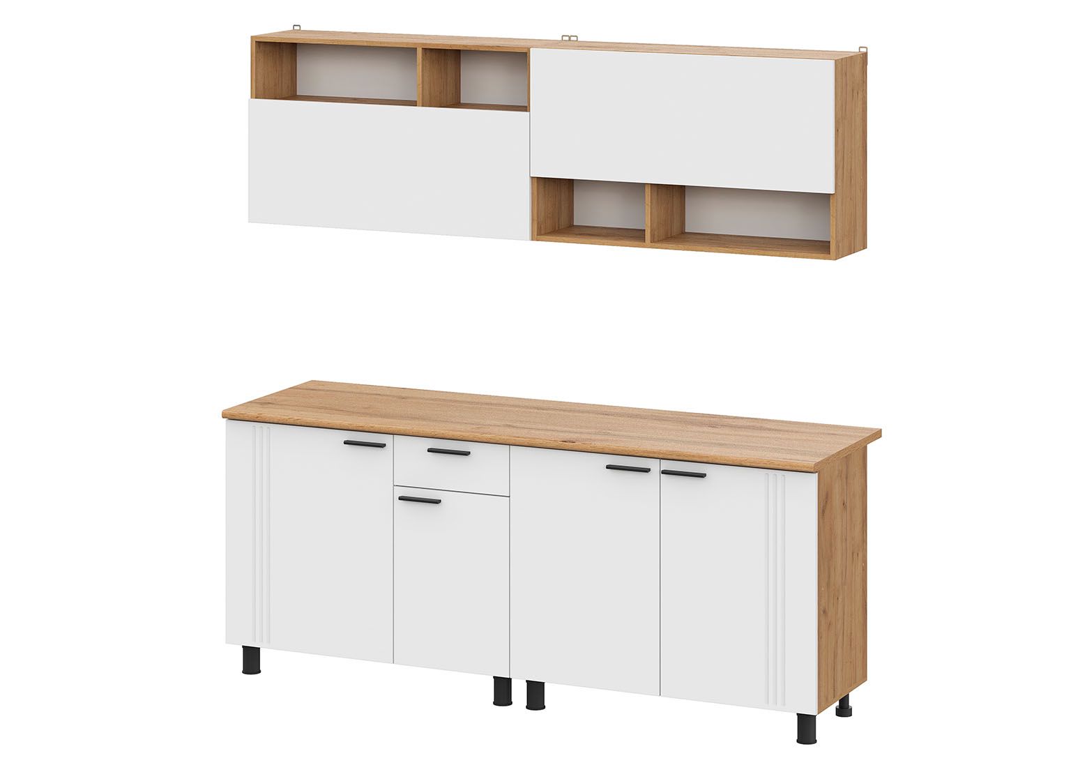 Верхние шкафы гарнитура «Монако» оснащены открытыми нишами, которые можно расположить как сверху, так и снизу — просто переверните модуль при установке! Это решение даёт гибкость в планировке и позволяет создать уникальный дизайн, подстраиваясь под ваши привычки и рост.