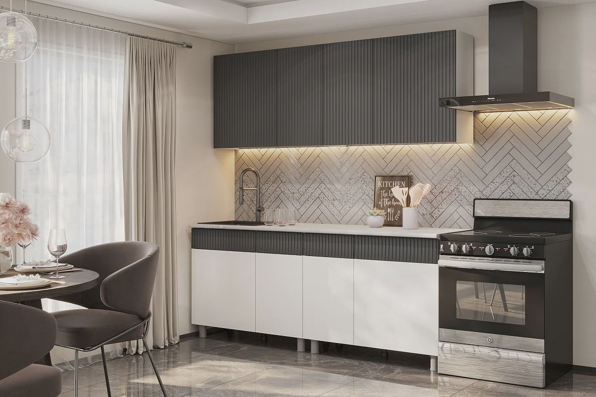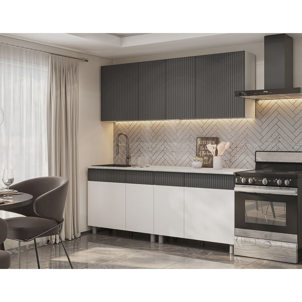 Современный кухонный гарнитур длиной 2000 мм — практичное решение для квартиры или студии. Лаконичный дизайн в сочетании с рифлёными фасадами верхних модулей создаёт актуальный интерьер с акцентом на текстуру и свет.