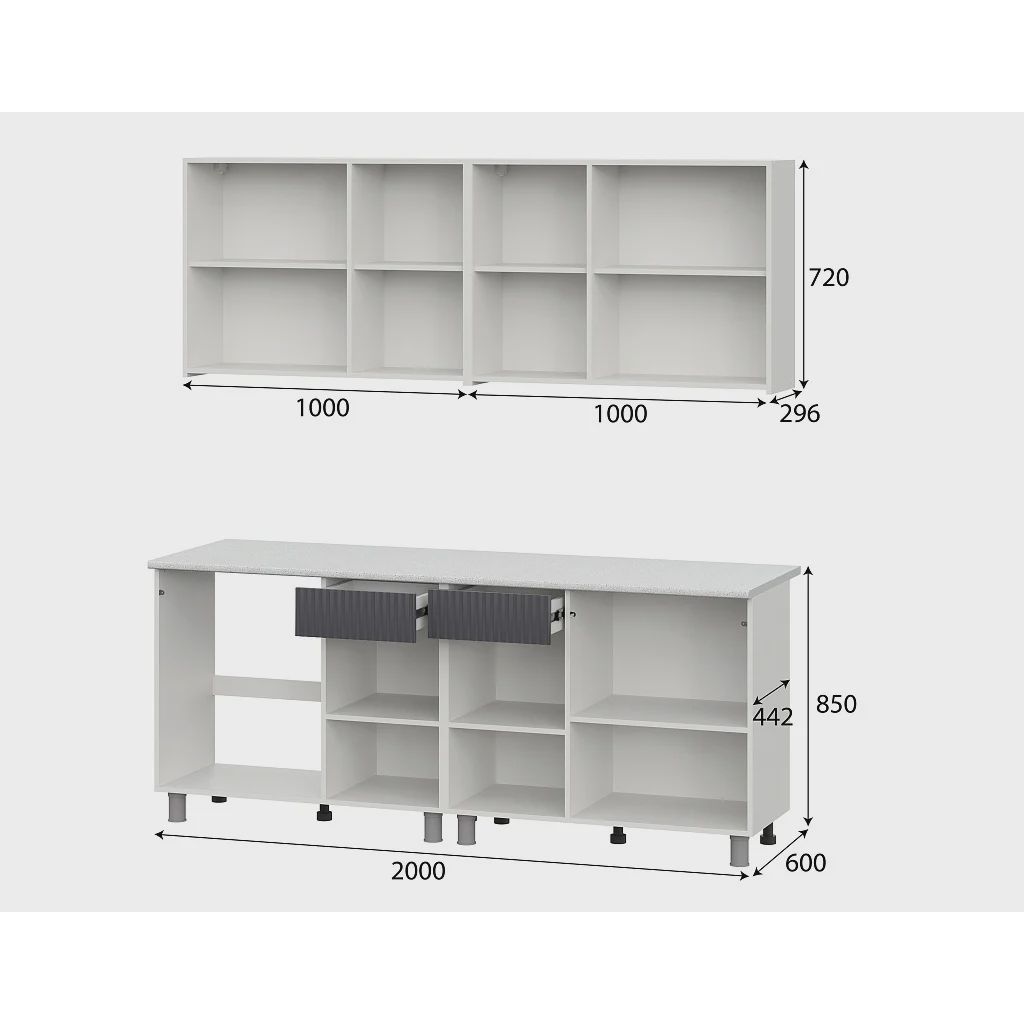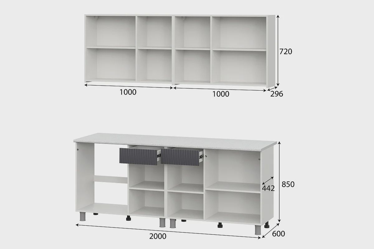 - Верхние шкафы — 2 модуля по 1000 мм