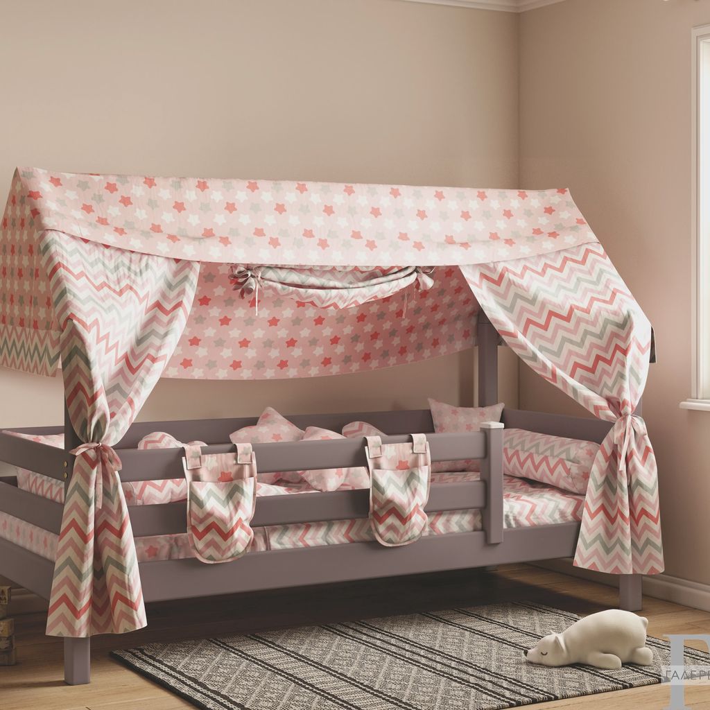 - Форма кровати в виде домика добавляет элемент фантазии и превращает сон в настоящее приключение.