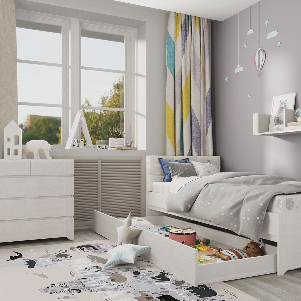 - Мягкое изголовье: высокая обивка делает кровать не только более уютной, но и функциональной - теперь ваш ребенок может удобно устраиваться перед сном с любимой книгой или планшетом.