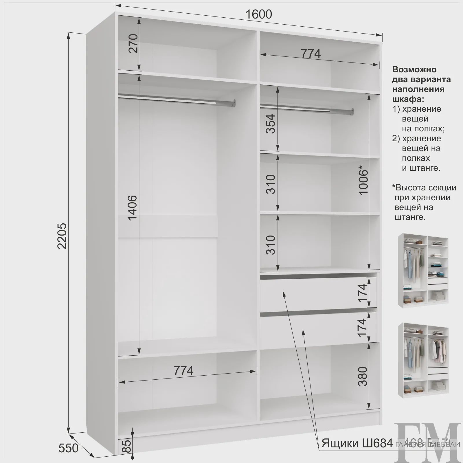 - Две секции с полками и штангой - идеально подходят для хранения одежды на вешалках и сложенных вещей.