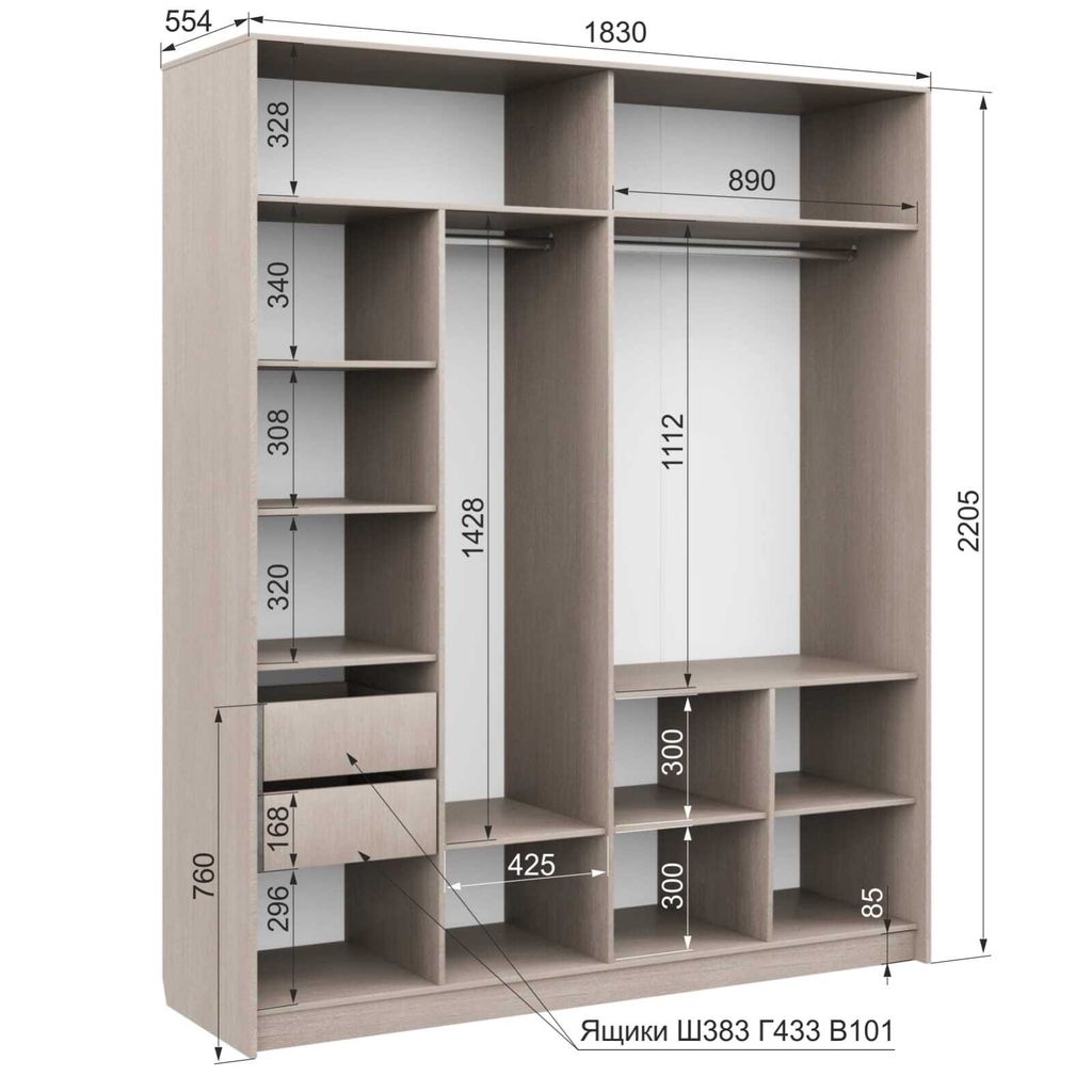 - Две штанги для вешалок — практичное решение для размещения одежды на плечиках (платья, рубашки, пиджаки).