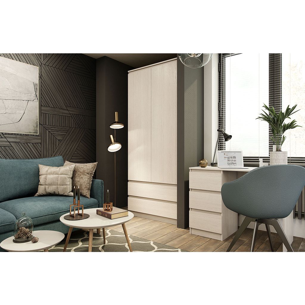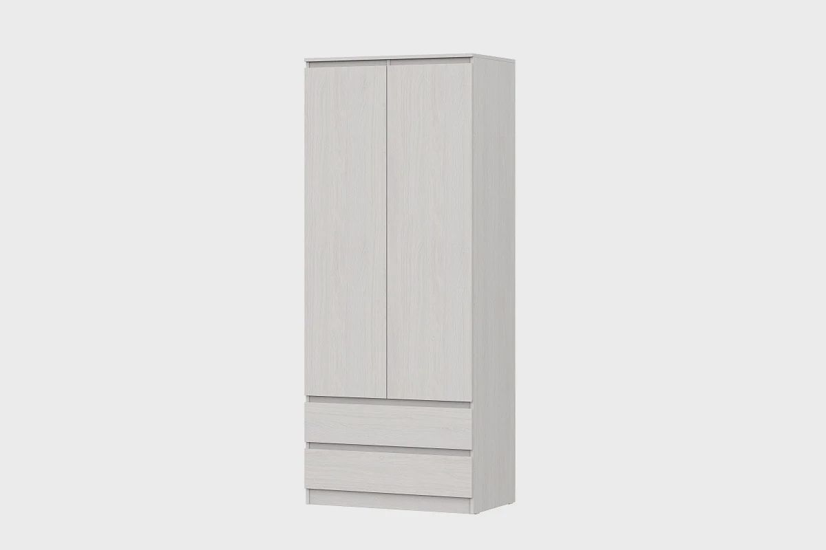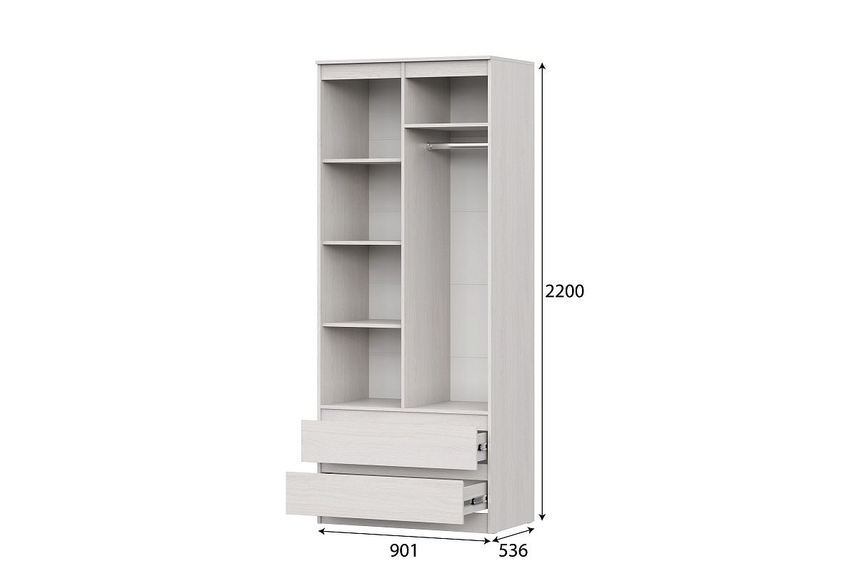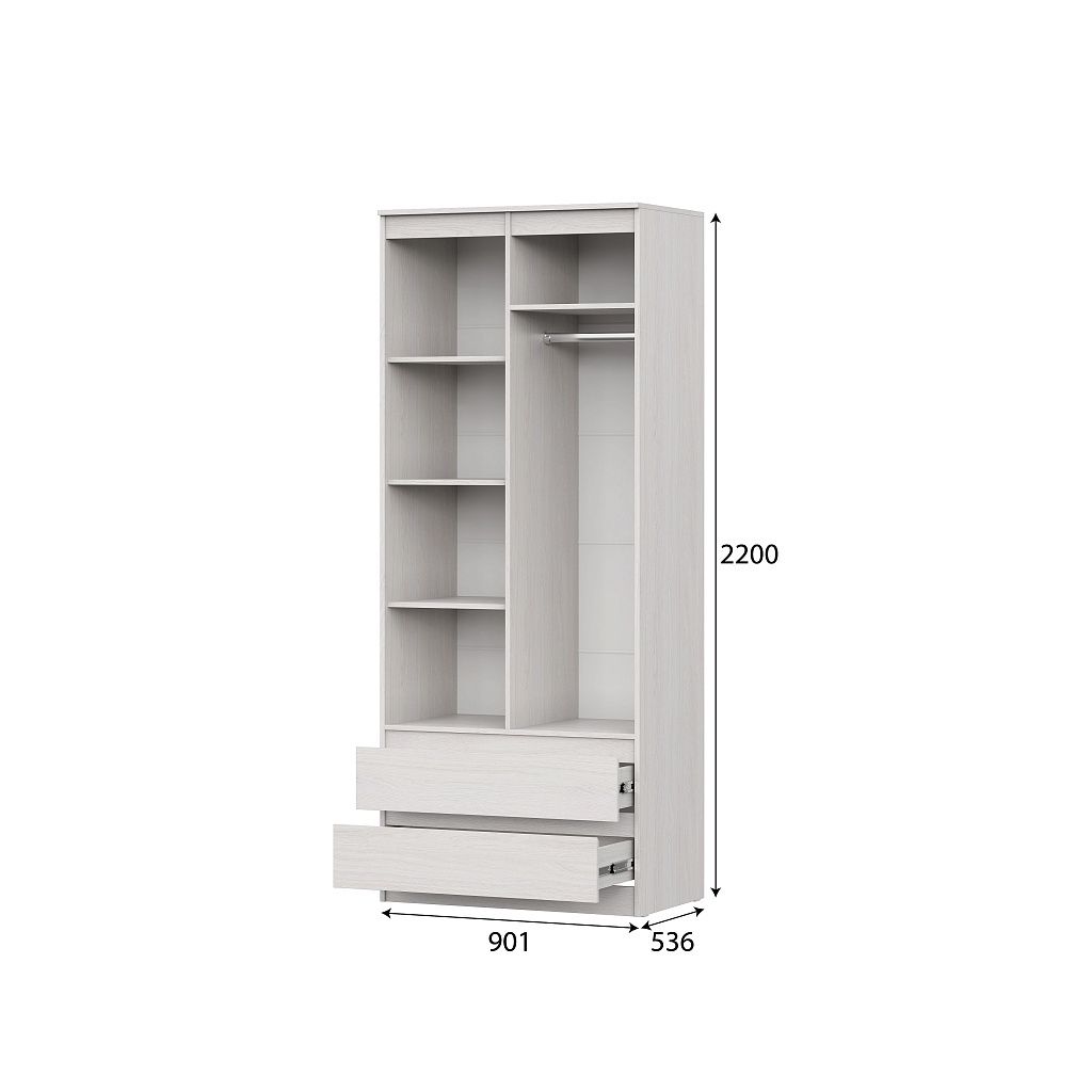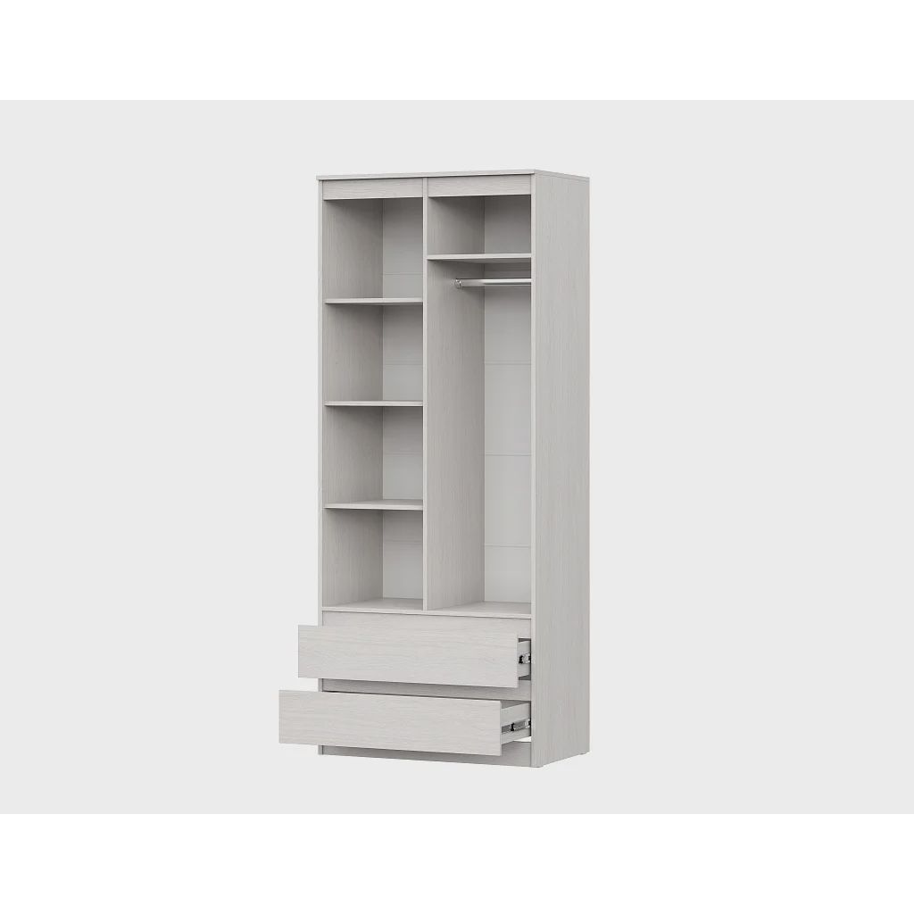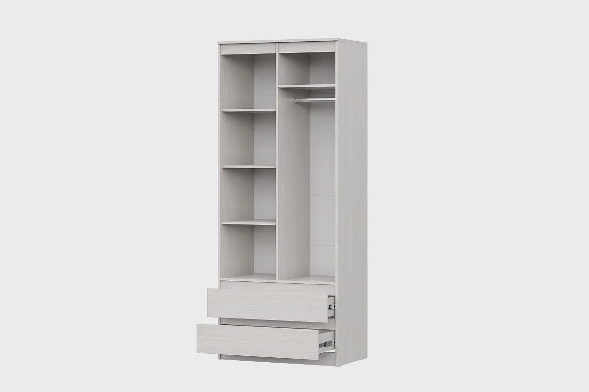 - Продуманная система хранения – базовая комплектация включает полки для белья, продольную штангу для одежды на плечиках, антресольную полку сверху для сезонных вещей и два выдвижных ящика для мелочей, аксессуаров и личных предметов.