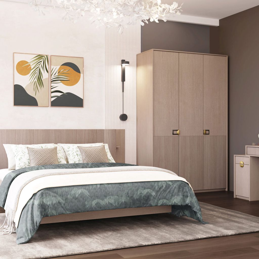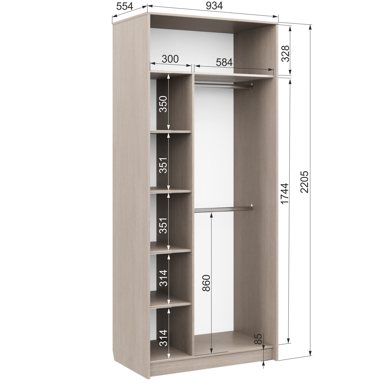 - Продуманное внутреннее наполнение – полки для сложенных вещей и аксессуаров, продольная штанга для одежды на плечиках. Всё организовано логично и доступно, без визуального хаоса.