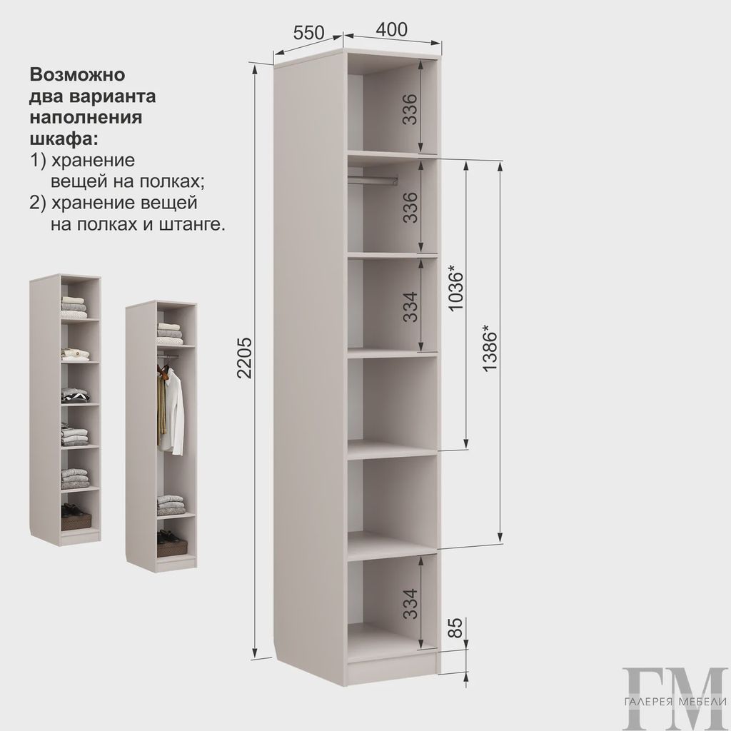 - Полки и штанга - комбинированное хранение: верхняя одежда на плечиках, а всё остальное — на полках.