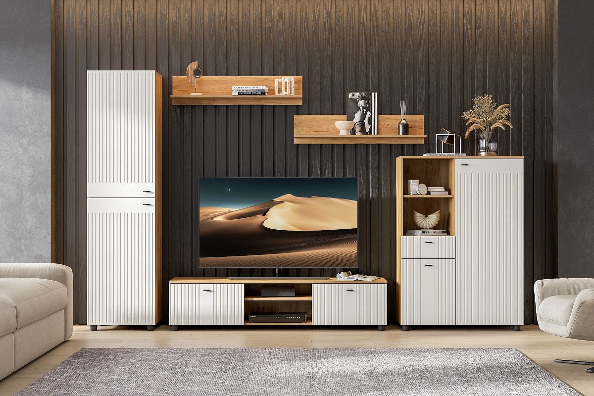 Пенал «Милан» с комбинированным оформлением дверец и стеклянными полками — стильное решение для гостиной, спальни или столовой.
