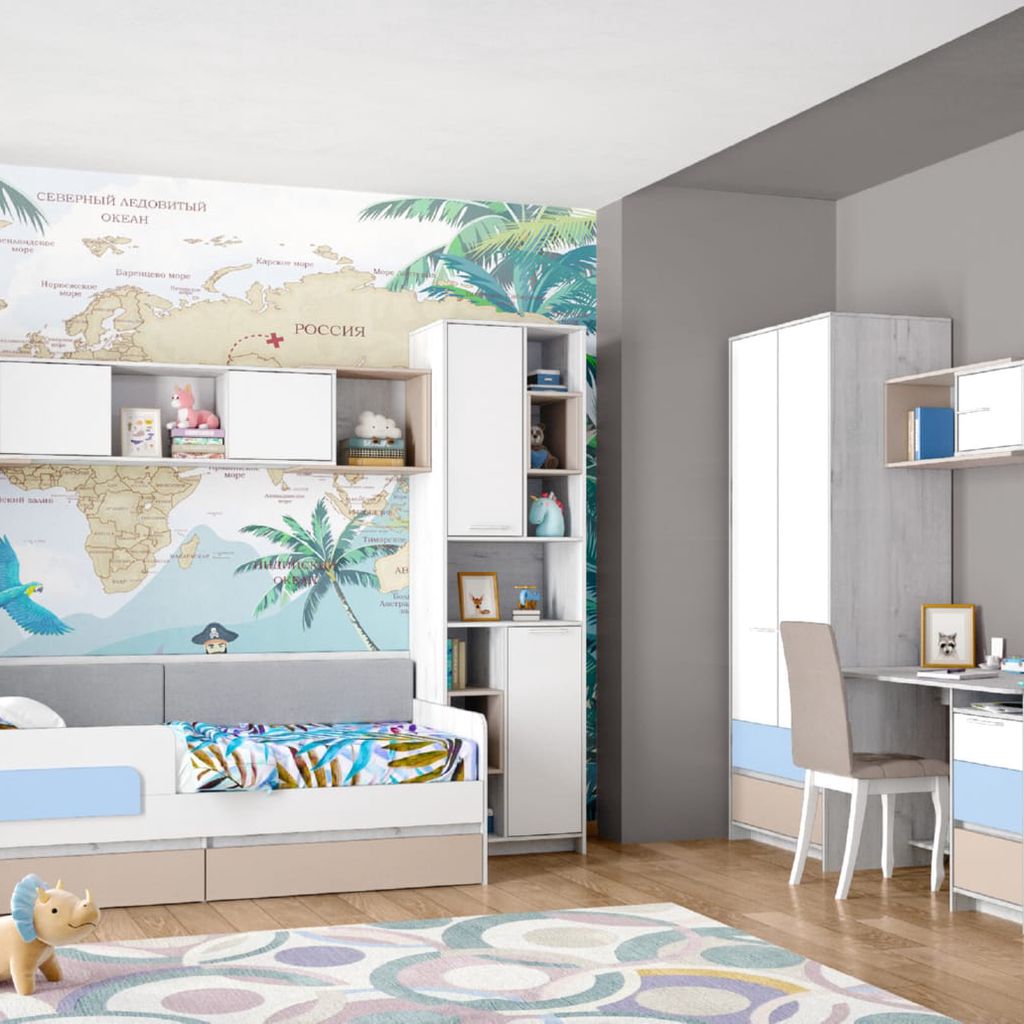 - Цвет: комбинированный - Дуб Эльза, Мокко, Белый и Голубой. Такое сочетание цветов добавляет стеллажу современности и делает его универсальным для любого интерьера детской комнаты.