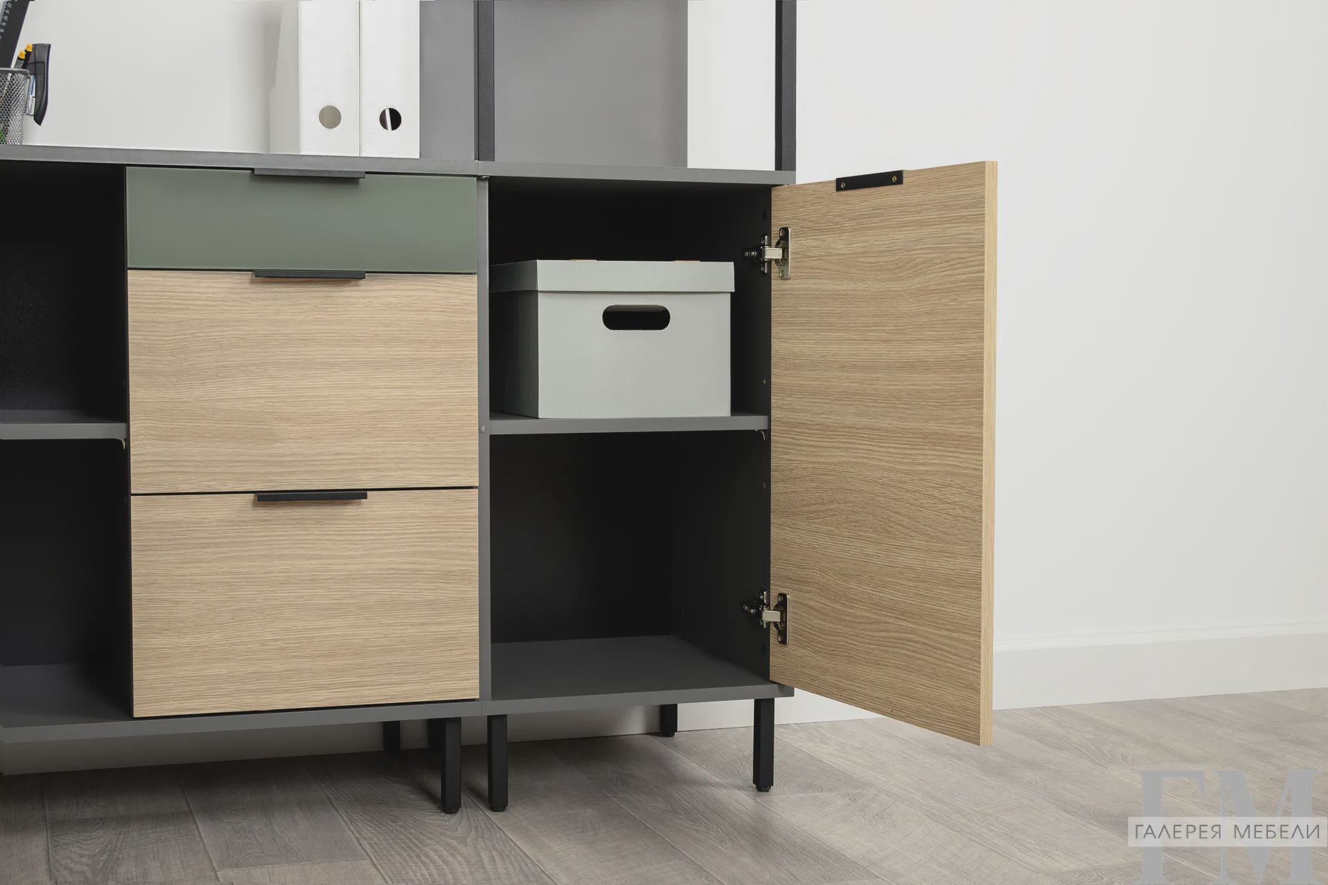 - Три открытые полки по центру - для книг, декора, рамок, цветов или коллекций.