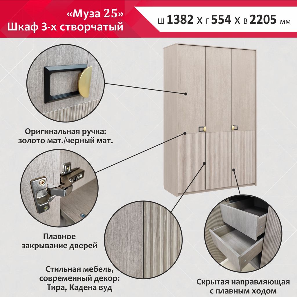 Шкаф «Муза 25» — идеальное решение для организации пространства в спальне, прихожей или гостиной. Сочетание продуманной конструкции, премиальной фурнитуры и стильного дизайна делает эту модель настоящим украшением интерьера.