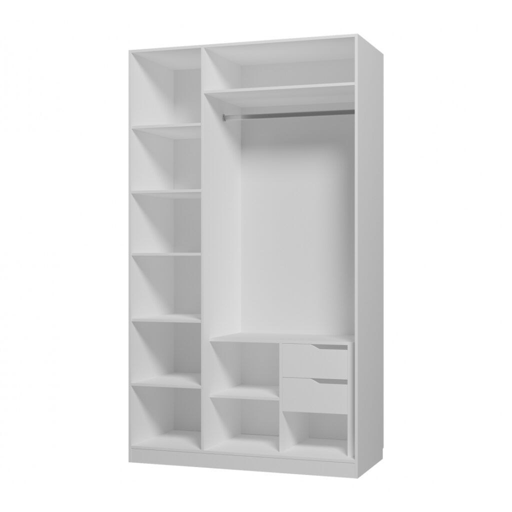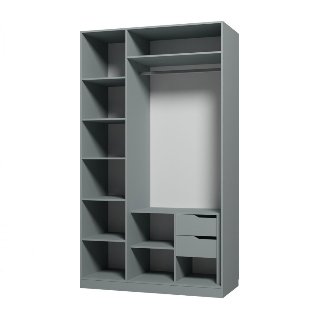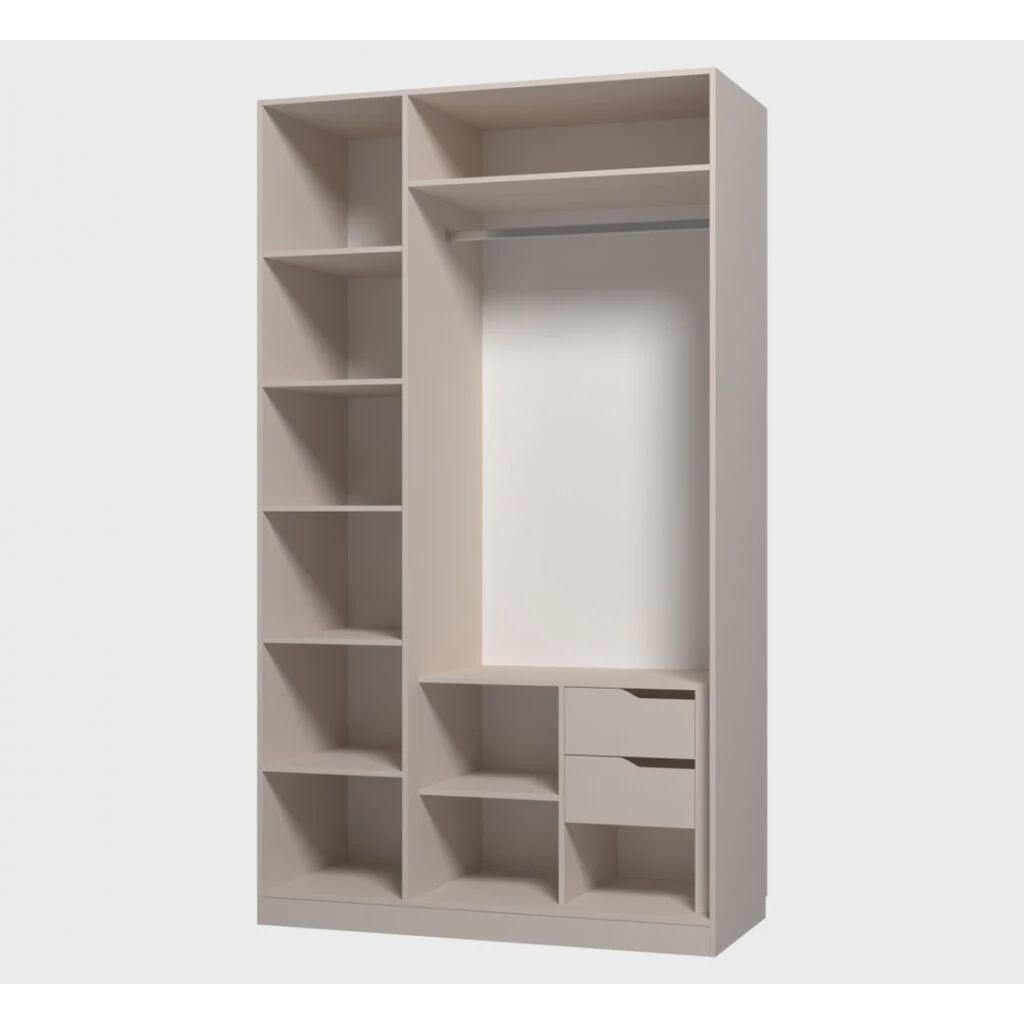 - Продуманная система хранения – полки для белья и аксессуаров, продольная штанга для одежды на плечиках, два вместительных выдвижных ящика для нижнего белья, носков и мелочей, антресоль сверху для сезонных вещей. Всё организовано логично и доступно.