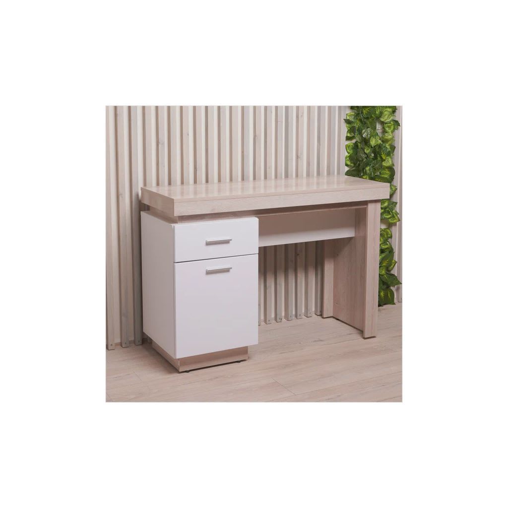 - Тумба слева: компактная тумба с выдвижным ящиком на шариковых направляющих полного выдвижения и дверцей, за которой находится полка для дополнительного хранения.