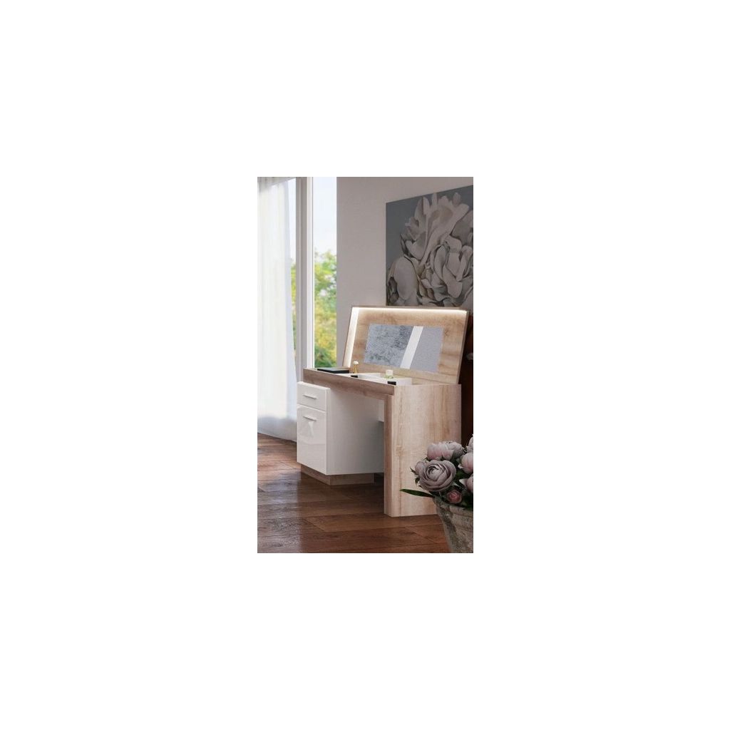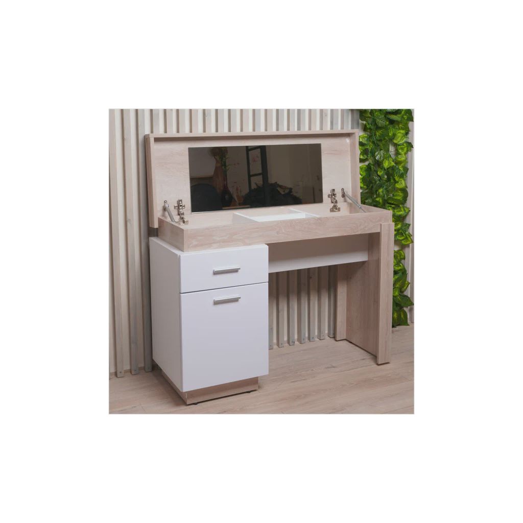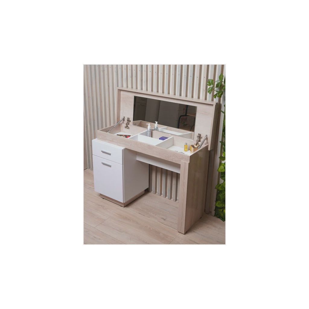 - Откидная столешница: под крышкой скрывается встроенное зеркало и специальные отсеки для хранения украшений, косметики и кремов, что делает пространство максимально организованным.