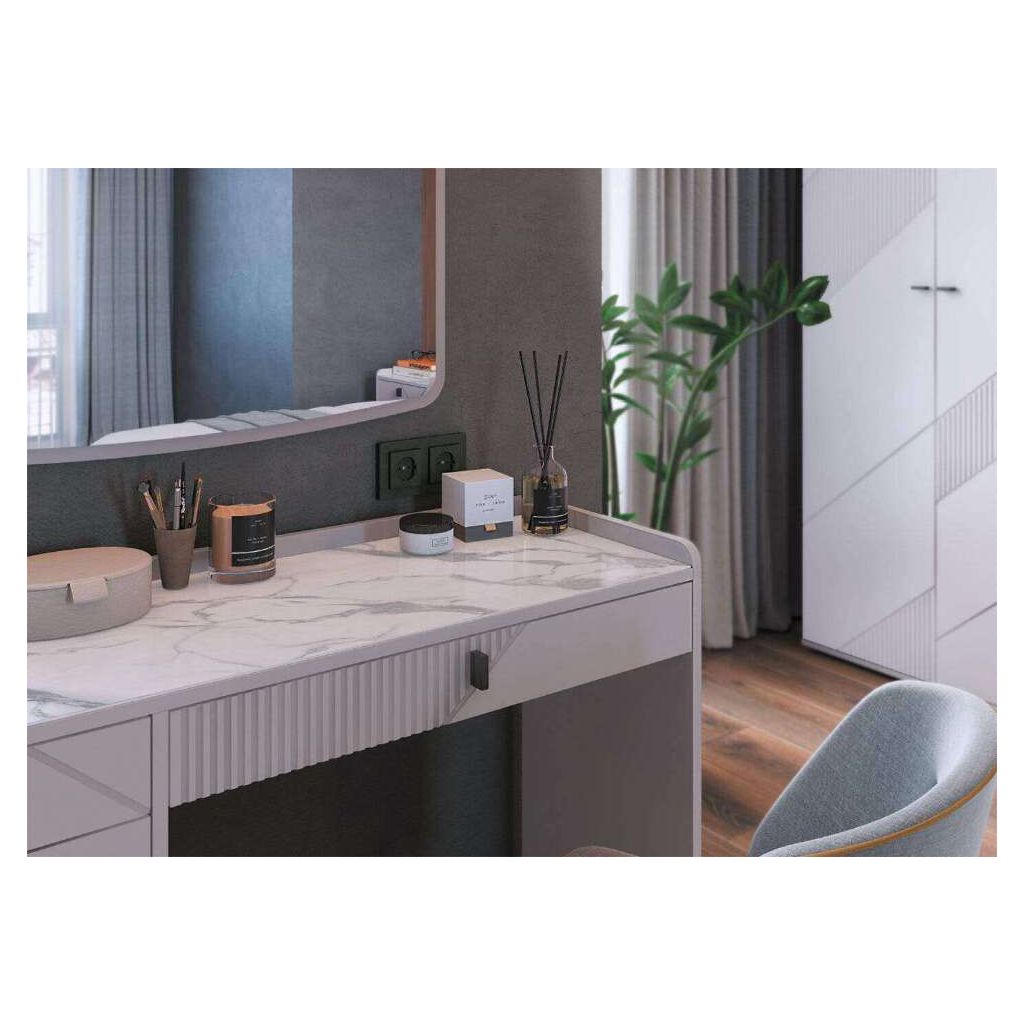 Туалетный столик "Кашемир" - это изысканное сочетание современного дизайна и практичности, которое станет центральным элементом вашей спальни. Элегантная модель создана для комфортного нанесения макияжа и эффективного хранения косметических принадлежностей.