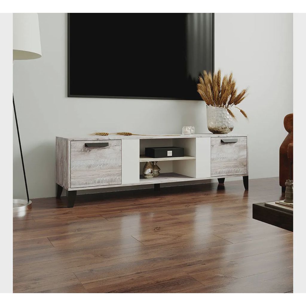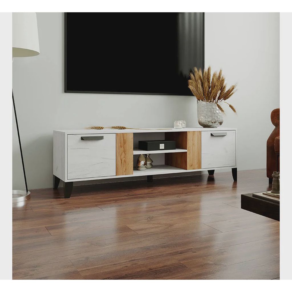 - За двумя дверцами полки: закрытые секции с полками обеспечивают скрытое хранение вещей, таких как медиаприставки, провода, книги или бытовые принадлежности. Дверцы помогают поддерживать порядок и защищают содержимое от пыли.